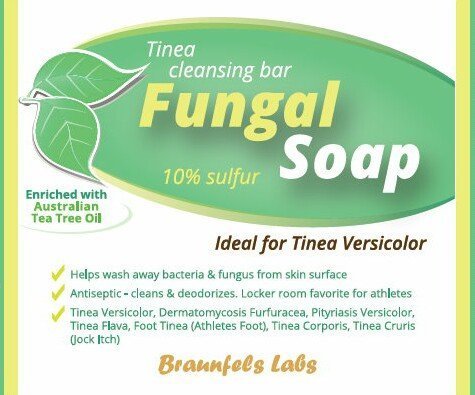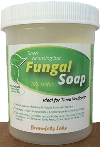 Studio : Braunfels Labs Publisher : Braunfels Labs Binding : Misc. Product Description Special offer. Premium Fungal Soap 10% Sulfur Soap anti-fungal wash for Tinea Versicolor. Packaged with 10 mL bottle of Australian Tea Tree Oil, with special Euro dropper design. --- Tinea (often called ringworm) is any of a variety of skin mycoses. Tinea is a very common fungal infection of the skin. Tinea is often called "ringworm" because it is circular, and has a "ring-like" appearance. Athlete's foot ( ringworm of the foot,tinea pedis, tinea pedum, and moccasin foot) is a contagious dermatophytic fungal infection of the skin that causes scaling, flaking, and itching of the affected areas. Plant based ingredients are blended using Braunfels Labs advanced processes - temperature, pressures and stage times during compounding. This proprietary colloidal system is a dispersed phase (internal) continuous phase (dispersion medium) bar form that when wetted and activated creates an effective creamy emulsion lather; cleansing your skin with the active ingredients. 0