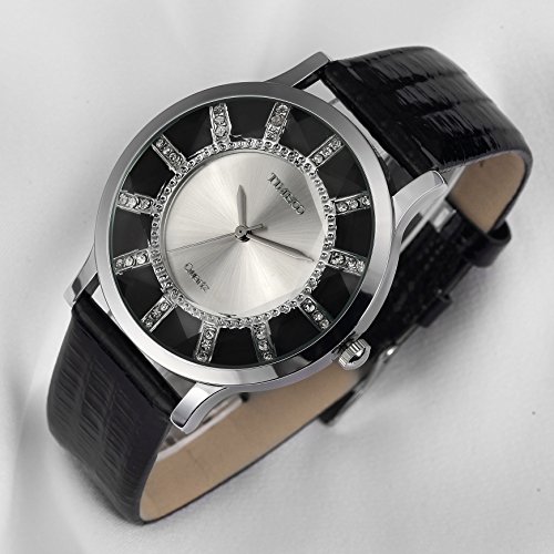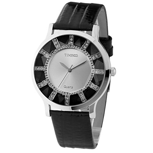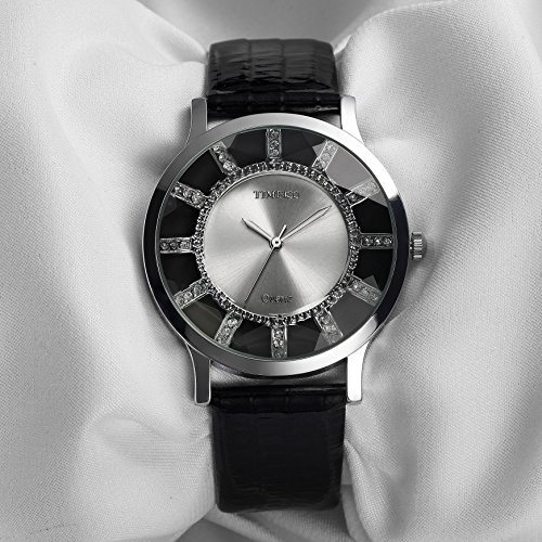 Time100 Women Retro Diamond Cutting Glass Black Leather Strap Golden Dial Ladies Watch