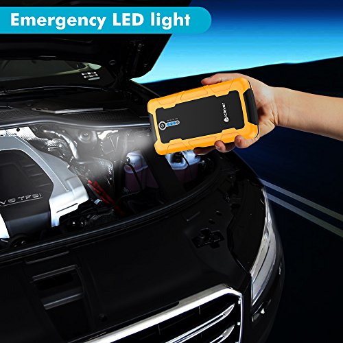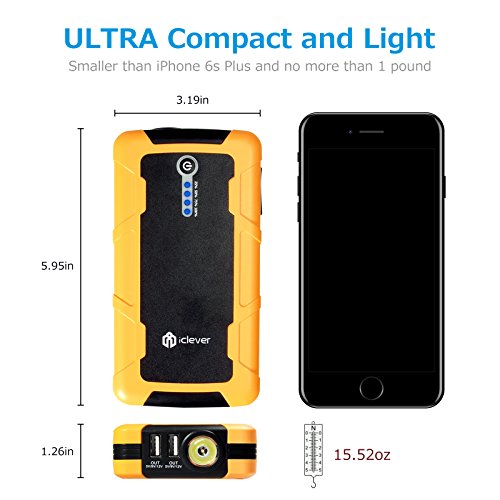 [Quick Charge In & Out] iClever 15000mAh Peak 600amp Portable Car Jump Starter BoostEngine External Power Bank with Multiple Protected Smart Clamp, 100 Lumen LED Light, Yellow