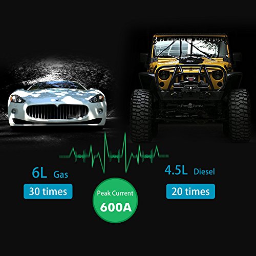 [Powerful and Compact]: Jump start your vehicle (up to 6.0L(T) petrol or 4.0L(T) diesel engine) or 12V 10A lawnmower up to 30 times with this 600 amp of peak current 15000mAh car jump starter and heavy duty clamps and cables. Compact enough to store in your glovebox