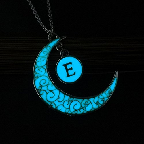 -. Title : Linsh Initial Necklace Glow in Dark Hollow Out Carved Moon E Letter Pendant Necklace Color: Silver