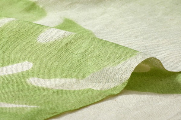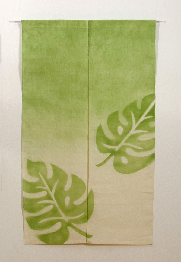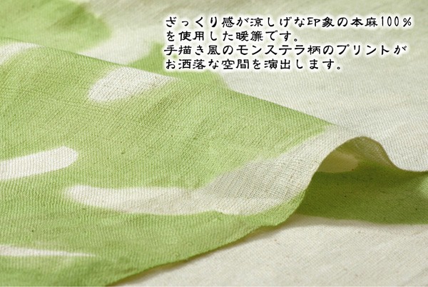 モンステラ柄をプリントした麻100%の暖簾です。生地は強度に優れた麻生地を使用しています。程良い透け感のざっくりとした質感に仕上げました。また、通気性が良いので自然の空気を通します。強い日差しを和らげる日よけとして、やわらかな目隠しに、間仕切りに、和の空間づくりになどご使用下さい。※のれん棒は付いておりません。