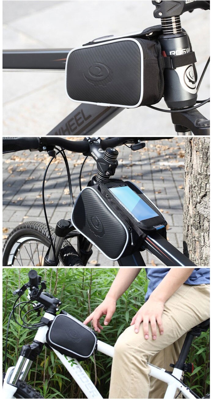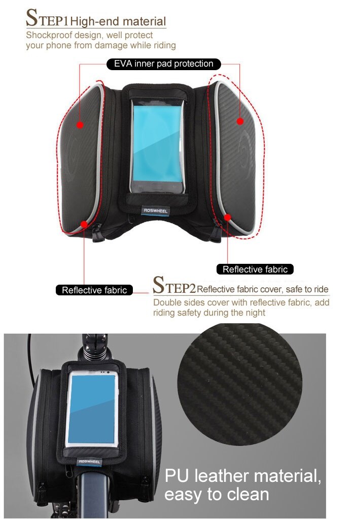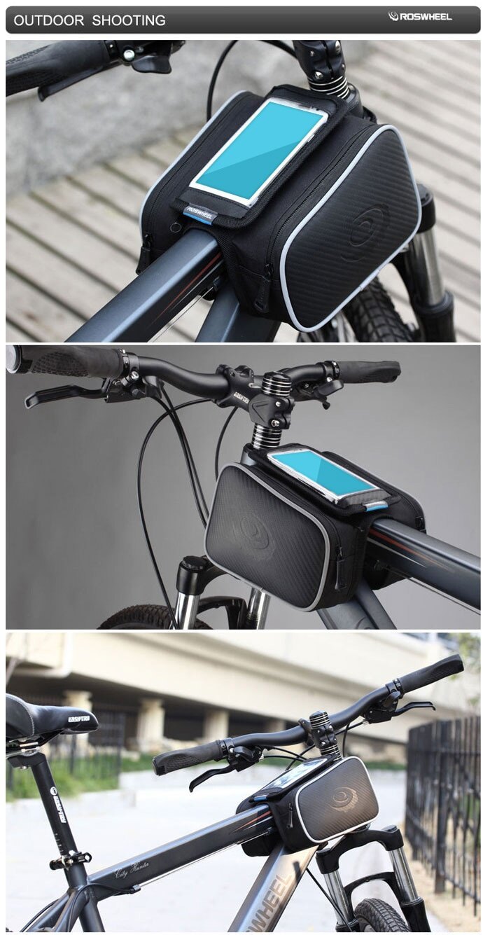 PackageContents: 1 x Roswheel 5.5 inch Shockproof Mountain BikeFront Frame Phone Bag with Dual Pouch for iPhone SamsungHTC