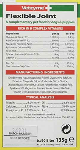 -. Binding : Misc. -. Brand : Vetzyme -. EAN : 5012335585607 -. Feature : Contains omega 3 and glucosamine / May help to maintain healthy cartilage and aid joint mobility / Also contains b- complex to help promote fitness and vitality -. Label : Bob Martin -. Manufacturer : Bob Martin -. Model : S5856 -. MPN : S5856 -. PackageQuantity : 1 -. PartNumber : S5856 -. ProductGroup : Pet Products -. ProductTypeName : PET_SUPPLIES -. Publisher : Bob Martin -. Studio : Bob Martin -. Title : Vetzyme Flexible Joint Tablets with Glucosamine, 90 Tablets