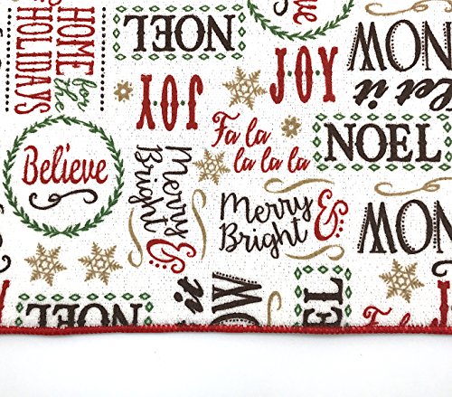 REVERSIBLE DRYING MAT featuring Warm Feel Good Phrases including JOY, HOME FOR THE HOLIDAYS, NOEL MERRY and BRIGHT, LET IT SNOW, and BELIEVE that Pop Against the Red Background Waffle Textured side is Beige