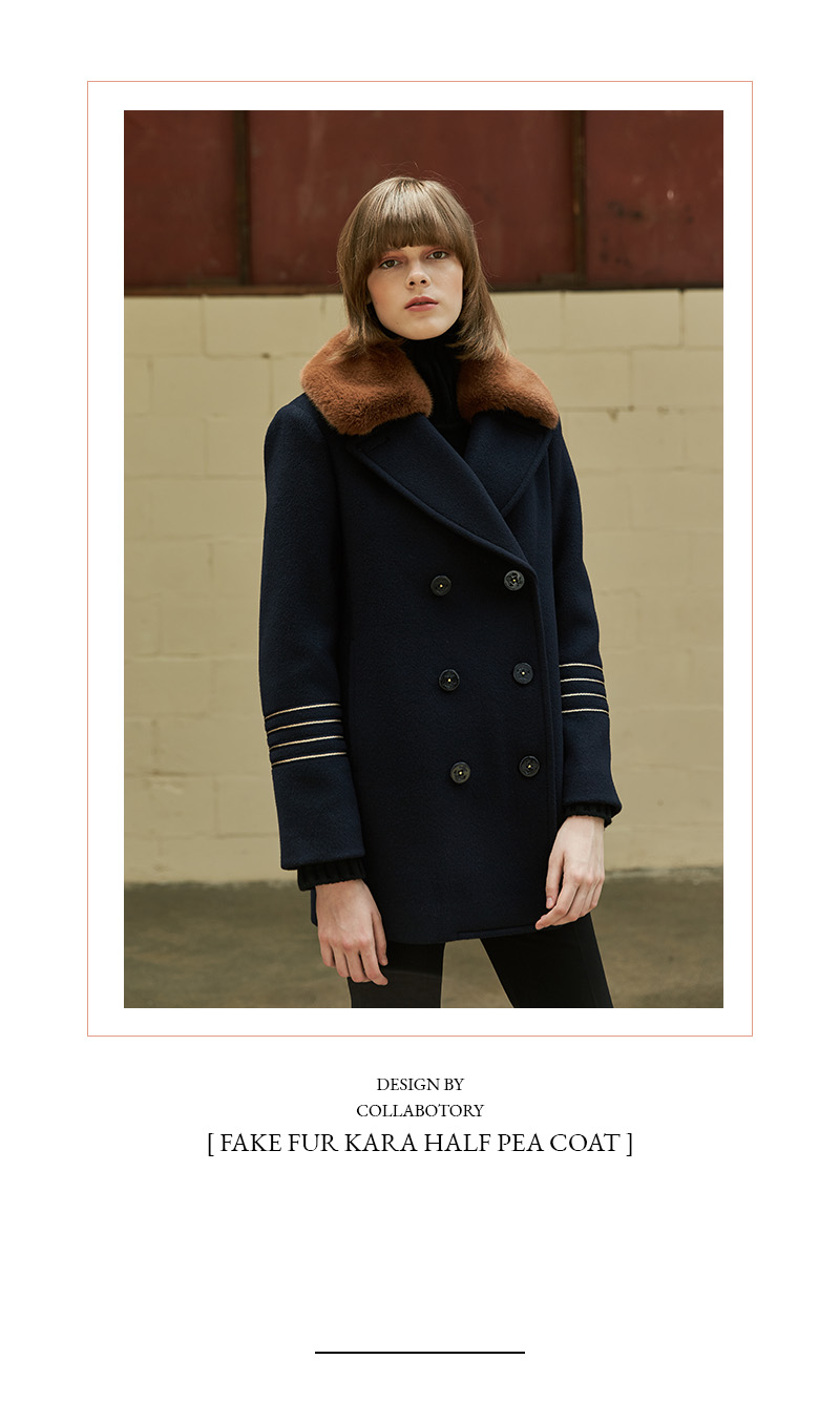 프렌치 쉬크의 대표 아이템인 피코트를 콜라보토리만의 감성으로 재해석한 탈부착 페이크 퍼 카라 하프 피코트입니다.
