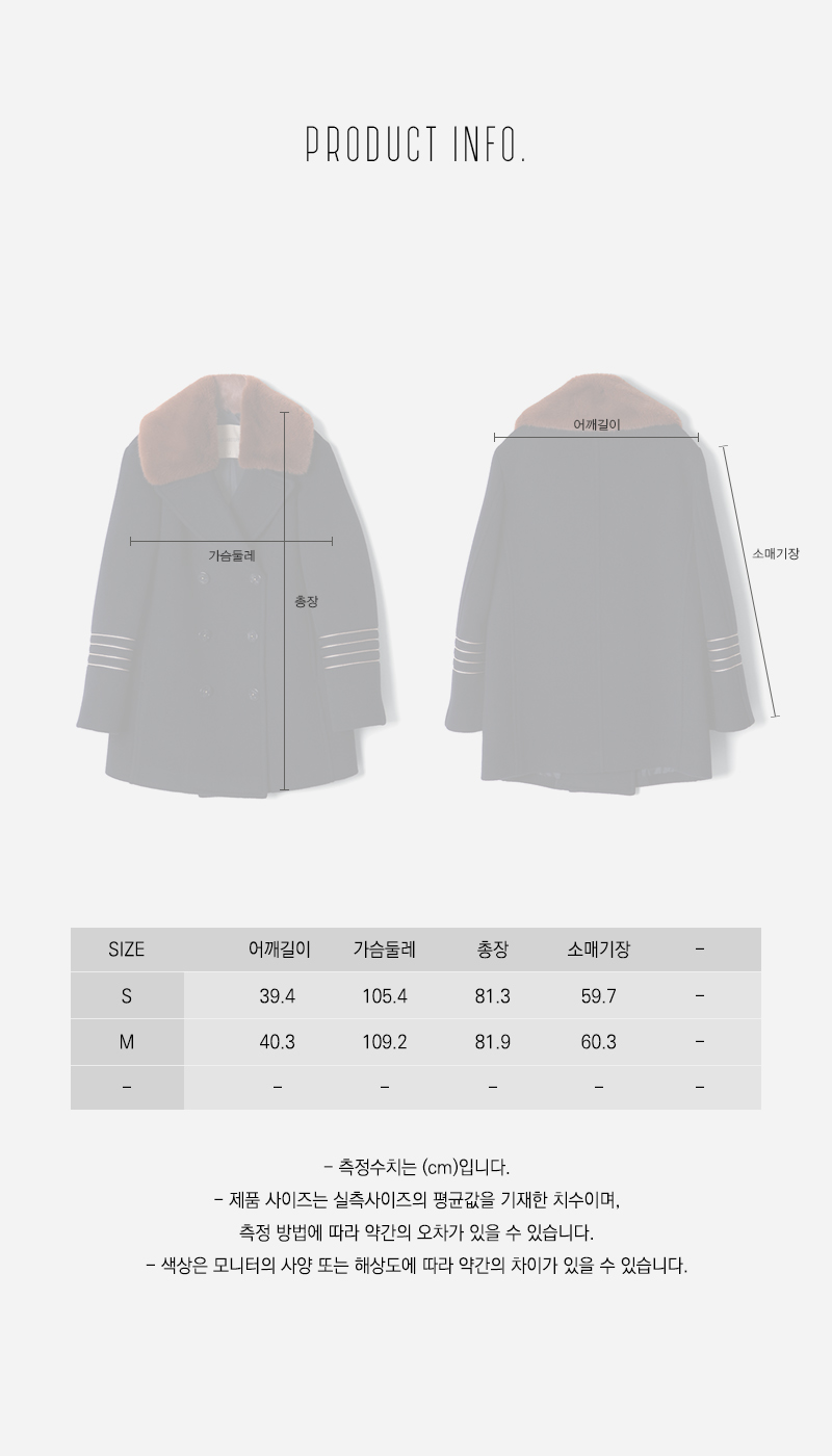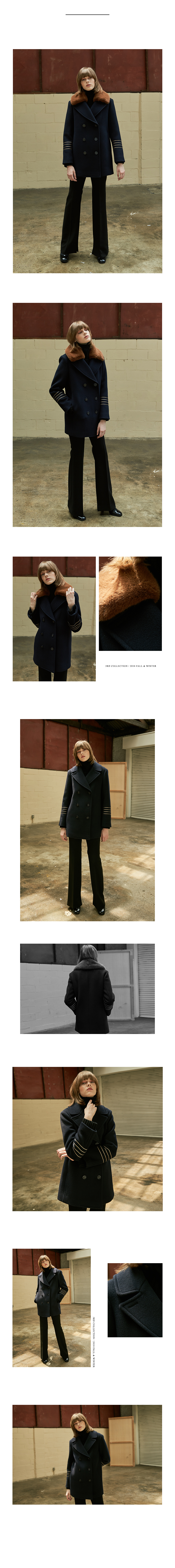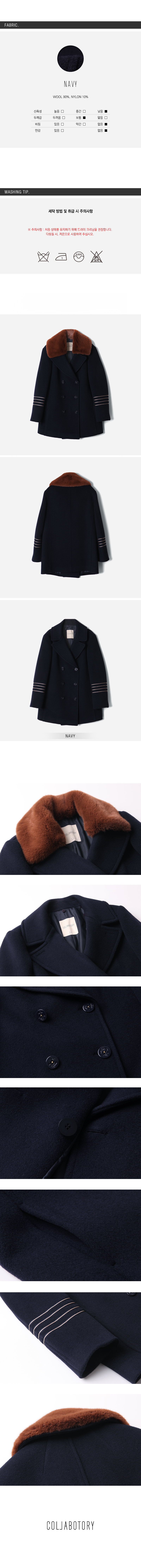 Point : 탈부착 가능한 브라운 페이크 퍼카라, 클래식한 하프 피코트, 4줄 골드 테잎장식