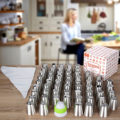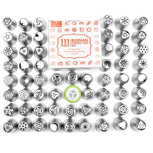 Kangora Russian Piping Cake Decorating Tips (111-Piece Set) Reusable Icing Nozzles, Couplers, Confectionary Accessories | Create Flowers, Hearts, Shapes, Designs (111)