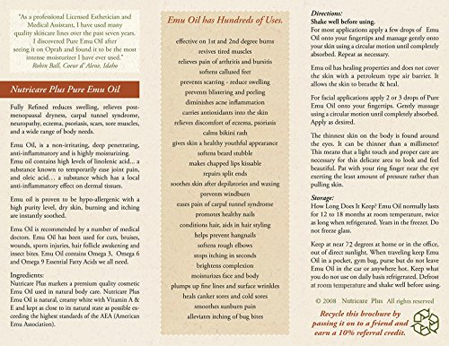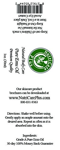 Studio : Nutricare Plus Publisher : Nutricare Plus Binding : Misc. Product Description Emu Oil is a highly regarded as a body piercing product and for tattoo aftercare: Used for piercing for the eyebrow, nose, tongue, lip, belly button, nipples, scarring, dry skin, cuts, scars, wounds, bruises, cold sores, insect bites, athlete's foot, sore muscles, burns, swelling, blistering, peeling, diminishes acne, black heads, scars, and bikini rash. Nutricare Plus Pure Emu Oil .5oz/15ml and the 1oz/30ml is packaged in a white plastic and blue glass dropper bottles, and Nuticare Plus 4oz/120ml plastic bottles, all with screw-on caps. The droppers and rollons are lightweight, convenient size, perfect for dispensing oils accurately; one drop at a time, allowing your emu oil to last up to twice as long. Pure Emu Oil gives skin a healthy youthful appearance, stimulates collagen, brightens complexion, plumps up fine lines, reduces age spots and increases the skin by 2.5 times while re-hydrating antioxidants several layers into the skin. Emu Oil has hundreds of uses ? 1st and 2nd degree burns ? scarring ? reduce swelling ? blistering and peeling ? diminishes acne - black heads - acne inflammation ? calms bikini rash ? makes chapped lips kissable ? repairs split ends ? prevents windburn ? helps prevent hangnails ? stops itching in seconds ? promotes healthy nails ? moisturizes face and body ? soothes sunburn pain ? alleviate itching of bug bites.