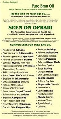 Emu Oil improves general quality of the skin ? improves hair general quality ? reduces appearance of age spots ? relieves psoriasis and eczema ? reduces scarring ? dermatitis ? relieves pain of arthritis and bursitis ? calms flare-ups from rosacea ? revives tired muscles ? moisturizes cracked, chapped skin ? relieves Achilles tendentious ? heals minor cuts and scratches ? cosmetic peels ? relieves sports related injuries ? relieves dry, irritated nasal passages ?hastens healing of hemorrhoids ? soothes radiation treated skin ? reduces roseola ? rashes ? softens callused feet. 0