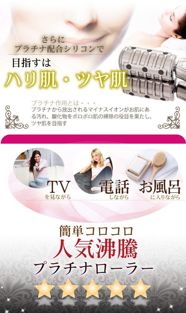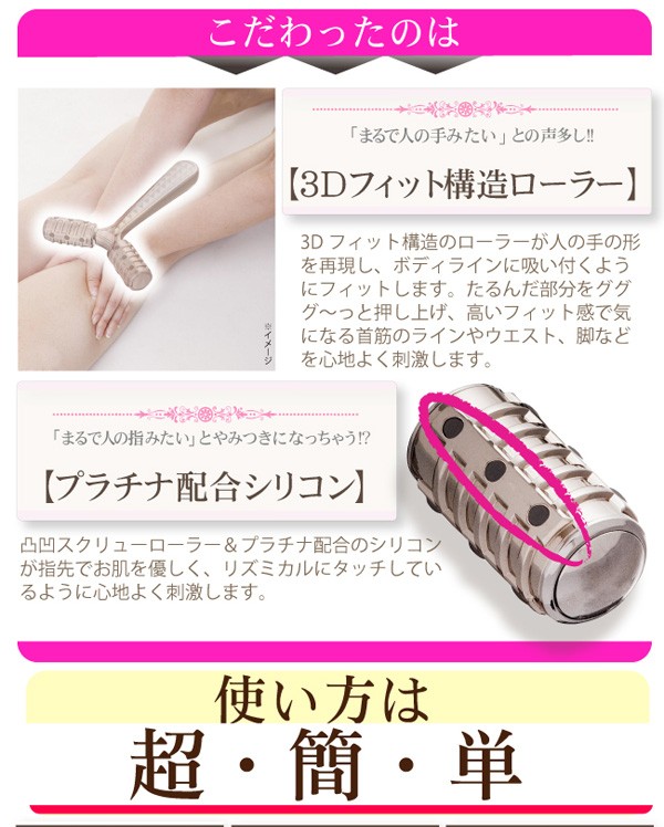 持ち手の一番厚みのある部分を中心に、しっかり握ってください。身体の丸みある部分に沿って、やさしく転がします。下から上へ往復させるように転がすのがポイントです。首筋、二の腕、肘、手の甲、ウエスト、ヒップ、太もも、膝裏、ふくらはぎなどにお使いいただけます。 |