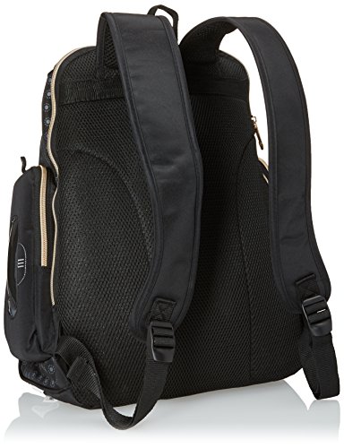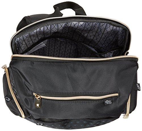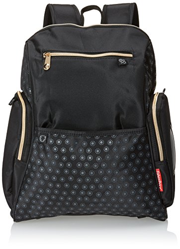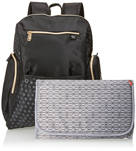 You're super stylish, hands free and road ready with this hard working diaper backpack in chic, go-with-everything black. A trendy, geometric-print front panel ups the appeal, and you'll go for the gold zippers and logo embossed pulls. It features the FastFinder Pocket System that includes an insulated Peva bottle compartment, wipes case, diaper compartment, and handy paci compartment-so everything's within easy reach. The light grey lining makes items inside easy to find, and the padded back and adjustable shoulder straps earn it high marks for comfort. A wipe-clean changing pad is included, so you're always good to go.Feature