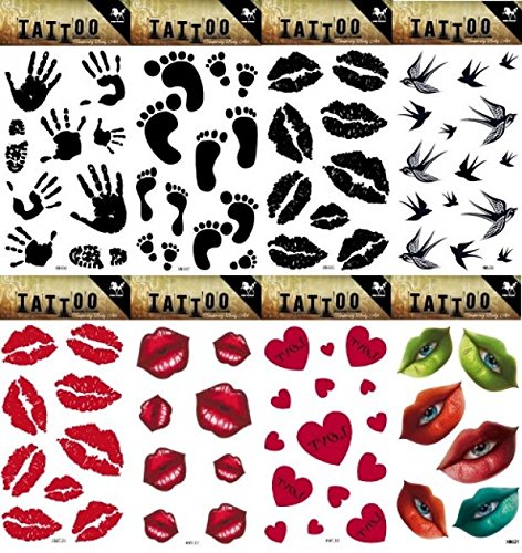 Wonbeauty 8pcs different Fake and real temp tattoo stickers in a package, it including black lips,red lips,red heart,handprints,footprints,colorful eyes and...
