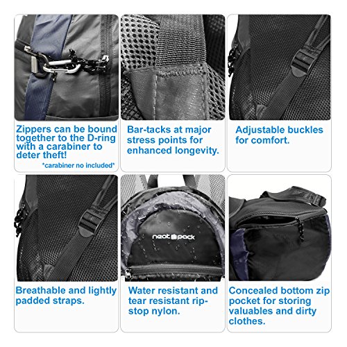 Worried about pickpockets when traveling to new areas? Our compression backpack has cool security features you won't see anywhere else. The main compartment's double zippers and front pocket zipper can be secured to the D-ring with a cable lock or carabiner to deter thieves! The NeatPack Foldable Backpack is also great for everyday use: the gym, commuting to work, running errands, shopping & more. Made of heavy duty RipStop nylon, it's not only stylish-looking; it's made to go the distance. Get yours today!