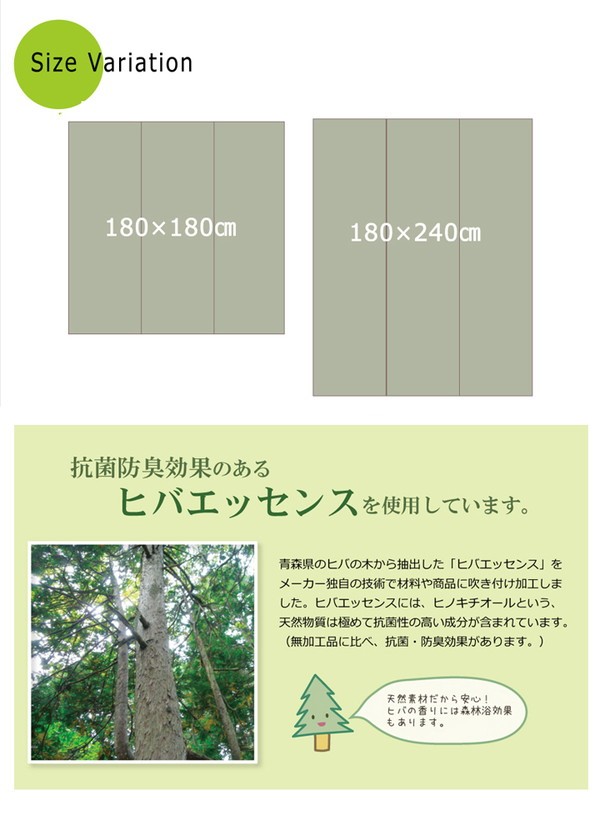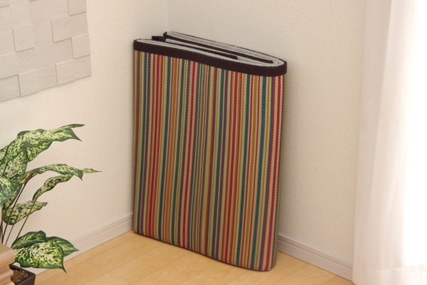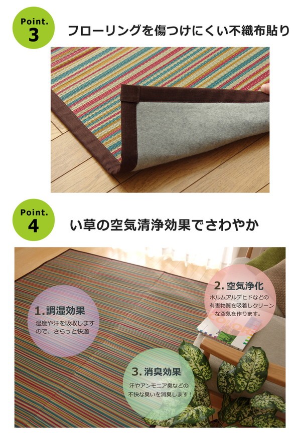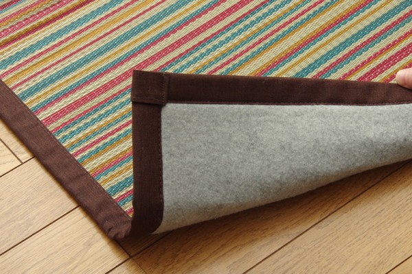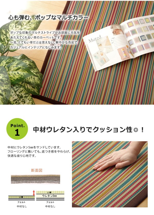 カラフルなデザインのい草ラグです。中材にはウレタンフォームを5mm使用し、ふっくらとしたふみ心地に仕上げました。フローリングでも底付き感を軽減してくれます。またい草には空気の自然浄化作用、湿度の調節作用などがあります。こちらの商品はい草に青森ヒバ加工を施しています。(抗菌、防臭効果)