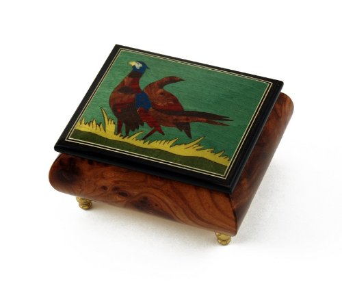 Product Description Handcrafted by the old world Artesian of Sorrento, Italy 18 Note Movement (please see above list for available tunes) Wood inlay of 2 Pheasants with nature scene Constructed of solid burl-elm with 2 tone (green and natural wood tone) stain Brass hardware 0