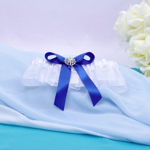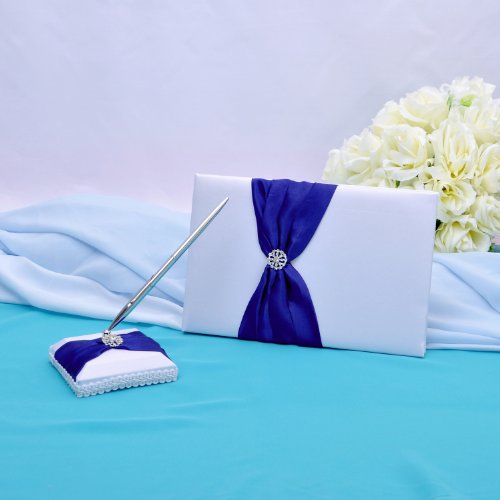 This is an elegant, white and royal blue satin set for your special day. This wedding package includes a flower girl basket, a ring bearer pillow and a guest book with pen set and a bridal Garter