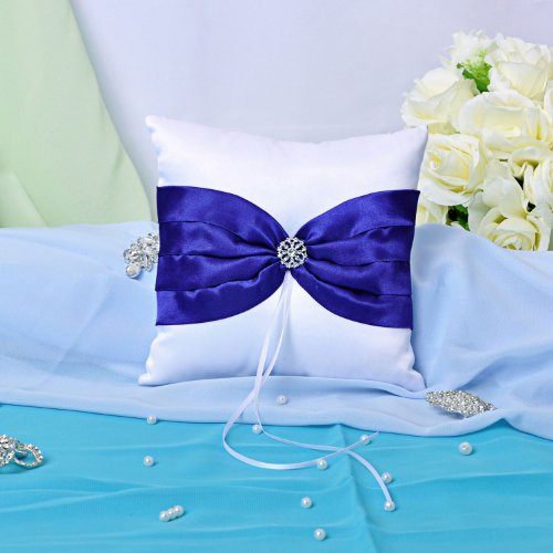 The pillow measures 8"x 8". This beautiful pillow is made of soft white bridal satin fabric. Features a silky royal blue satin ribbon tied around the pillow.