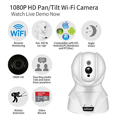 -. Feature : STUNNING 360° FULL VIEWING EXPERIENCE: Adjustable Pan/Tilt move the camera as you desired. Pan horizontally up to 350°, tilt vertically up to 100° give you a full view of any room. Moreover, 8 time digital zoom makes it happen that viewing all details as you like. Super Hi-Vision AR lens capable of streaming video at 1280 x 720p HD quality, the image is very clear and exquisite. / DATA PROTECTION AND REAL TIME MONITORING: Free apps for Android and iOS, seamlessly stream video directly to your smartphone, tablet and PC. On the premise of keeping your data safe, 1024bits financial level cloud encryption technology applied to make sure the safety and reliability of your video transmission. / TWO-WAY TALK AND VERSATILE INSTALLATION: Stay in touch with built-in speaker and mic, listening and responding to what is going on while watching. Tell your dog to get off the couch or tell intruders that the police are on the way. 360-degree omni-directional voice collecting, professional speech processing chip reduce background noise and improve audio output. Versatile installation allows you place the camera where it suits you best including vertical, wall mount or ceiling. / 24/7 LIVE SURVEILLANCE AND MOTION DETECTION: App alerts with snapshot & record(Micro SD Card Required) to your mobile device when motion is detected. Also, motion detect sensibility, schedule recording and alerting can be adjusted by yourself. Continuous day/night surveillance is accomplished by IR-CUT smart system, powerful IR-LED for night vision up to 32ft. NOTICE: MICRO SD CARD REQUIRED (up to 64g) TO RECORD, NOT INCLUDED IN THE PACKAGE. / EASY TO SETUP: Simply plug in the power cable, download the app and add device by following on-screen instructions in just minutes. Quick Link Tech introduced and adopted to Safevant IP camera in order to build a more powerful WIFI signal coverage and make the connection quick and easy. NOTICE: Safevant IP CAMERA IS A 2.4ghz SUPPORTED CAMERA, NOT SUPPORTING 5ghz NETWORKS. Any concerns, our support team is available at 1-866-380-1888.