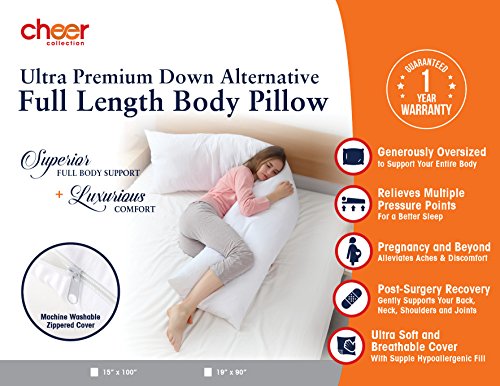 -. Brand : Cheer Collection -. Feature : This body pillow provides the utmost comfort and quality and is an essential product for people looking to get a good nights sleep / Full-body solution for everyone and will support your back preventing sciatica and lower back pain / Relieves pressure to many areas of the body, which reduces your need to toss and turn / Tucks between your knees for help with back pain and temperature control / The Pillow comes with a removable zippered cover for easy machine washing -. Label : Cheer Collection -. Manufacturer : Cheer Collection -. ProductGroup : Home -. ProductTypeName : HOME_BED_AND_BATH -. Publisher : Cheer Collection -. Studio : Cheer Collection -. Title : Cheer Collection Hypoalergenic Down Alternative Premium Total Body Pillow with Zippered Cover - White