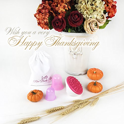 PACKAGE CONTENT 1 Large pink silicone cup: 3.15"x2.76" 1 Small purple silicone cup: 1.96"x1.96" 1 Massage brush (Ø4,33") 1 Users manual 1 Cotton travel bag NEW BODY LIFE MASSAGE TOOL SET
