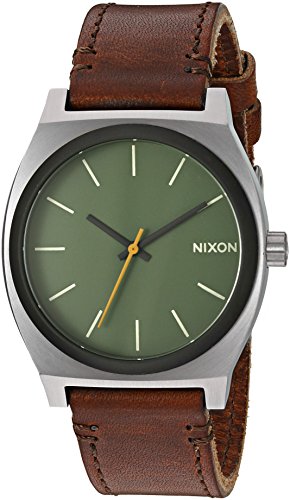 Raise the bar on good looks and better style with this Nixon Time Teller Leather watch. The smooth, surplus green dial features the Nixon logo at 3 o'clock and a bright orange seconds hand, giving this watch a versatile style that works in your uptight Monday meeting or on your casual brunch date. Comfortably securing the watch to your wrist is a brown leather strap with a stainless steel buckle closure. Finally, this watch boasts a 37mm stainless steel case and is water resistant up to 100 meters.Feature