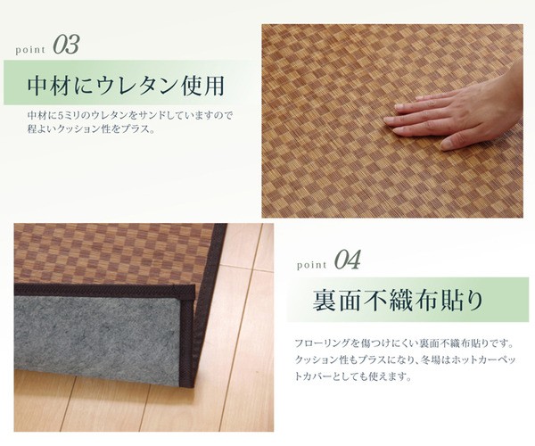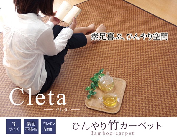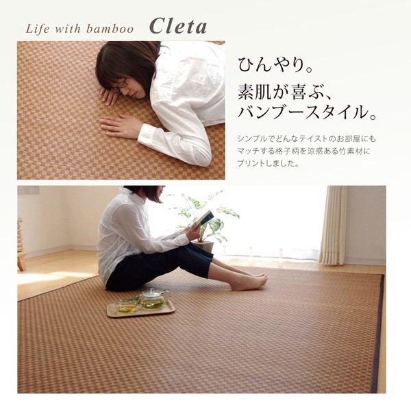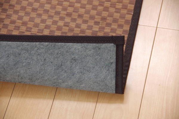 格子柄をプリントしたバンブーラグです。シンプルで敷きやすく、さらっとした足触りと裏面に不織布を使用しているため底付き感を軽減してくれます。フローリングにもぴったりの商品です。竹は耐久性に優れ、熱伝導率が高いため自然のひんやり感があります。