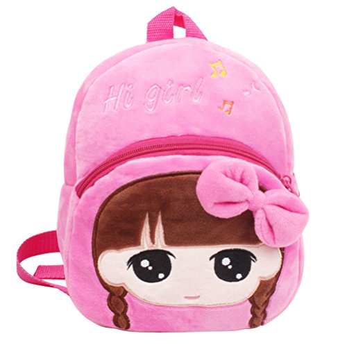 -. Feature : Lovely baby plush bag, unique design of cute girl shows children naive and lively. / Good gift for ages 1-2 years old girls ,with pink color. / Adjustable comfy straps, perfect for school, hiking, travel or as lunch bag. / Have enough space for your baby to put things, like toys, foods, fruits, books, pens, etc. / This is a special design for girl, size is suitable for your baby's body and it is very light.