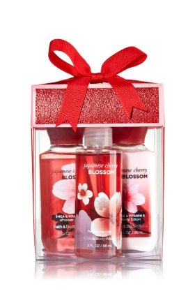 -. Feature : Bath & Body Works Japanese Cherry Blossom Petite Treats Gift Set / Petite perfection! Our travel-sized Shower Gel, Body Lotion and Fine Fragrance Mist (3 fl oz each) will treat your special someone to clean, smooth & beautifully fragranced skin. Boxed set comes ready to gift with a glittering lid & bright bow. / Top Notes: Asian Pear, Fuji Apple, Ume Plum Mid Notes: Japanese Cherry Blossom, Butterfly Lily, Kyoto Rose, Mimosa Petals Dry Notes: Vanilla Rice, Imperial Amber, Silk Musk, Cinnamon Incense, Himalayan Cedarwood, Creamy Sandalwood / KEY FRAGRANCE NOTES: America's #1 Fragrance Collection Japanese Cherry Blossom evokes the beauty of the exotic gardens of Japan with a graceful, award-winning blend of pear, Japanese Cherry Blossom & sandalwood / Set Box arrive assembled for you to wrap & give with love!