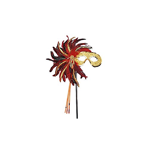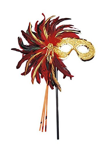 -. Feature : Gold, Red, Dark Green. Majestic Feathers Mardi Gras Eye Mask with Stick. Adult Standard Size (apprx 14 " wide x 20" tall including stick) / Feathers, Blend, Plastic Stick / Gold Metallic Eye Mask, Edged in Gold Sequins, Attached to Black Plastic Stick, Gold, Red and Irridescent Dark Green Feather Spray Accent Attached to Side of Eye Mask, / Red Metallic Streamer in Center of Feathers with Gold Center Detail, Elastic Band to Hold in Place Around Head