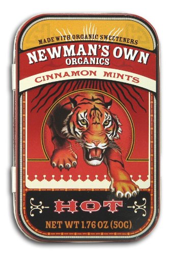 Studio : Newman's Own Publisher : Newman's Own Binding : Health and Beauty Product Description Cinnamon Mints, Organic Newman's Own Organics Cinnamon Mints, made with organic sweeteners. Hot. INGREDIENTS: Organic Sugar, Organic Corn Syrup, Gum Arabic, Natural Flavor, Beet Juice. Manufactured on equipment that may process products containing peanuts, other nuts, milk powder, wheat, and soy. Nutrition Facts Serving size: 3 pieces (2.0 g) Servings Per Container: 25 Nutrient Amount %DV Calories 10 Total Fat 0 g 0% Sodium 0 mg 0% Total Carbohydrate 2 g 1% Sugars 2 g Protein 0 g Not a significant source of calories from fat, saturated fat, trans fat, cholesterol, dietary fiber, Vitamin A, Vitamin C, Calcium, and iron. Kosher Parve, K810 Tins made in England. Mints made in Mexico. 0