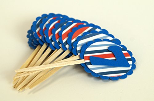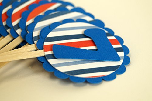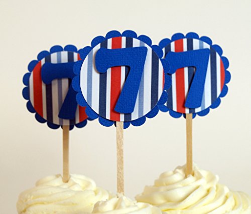 Studio : All About Details Publisher : All About Details Binding : Kitchen Product Description Celebrating 7th birthday is awesome! Decorate your cupcakes with these 7th Birthday Blue-red-white stripes cupcake toppers. Perfect to compliment similar color AAD's Happy Birthday Cupcake Wrappers. These toppers will also suit in train theme birthday party. Made up of 3 layers cardstock. - Blue textured cardstock for the circular scallop frame - Blue-Red-White stripes printed cardstock - Numeric design cut in blue textured cardstock The numeric one is set in double adhesive tape. This setting gives a floating illusion to the number. This cupcake topper has 2in diameter and 2.5in long food safe stick. The food safe stick gives you freedom on how tall you want the topper set in your cupcake. This cupcake topper compliments All About Details Blue/Red Trains Cupcake Wrappers and Blue/Red Happy Birthday Cupcake Wrappers. 0