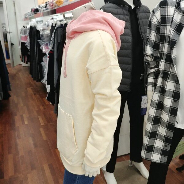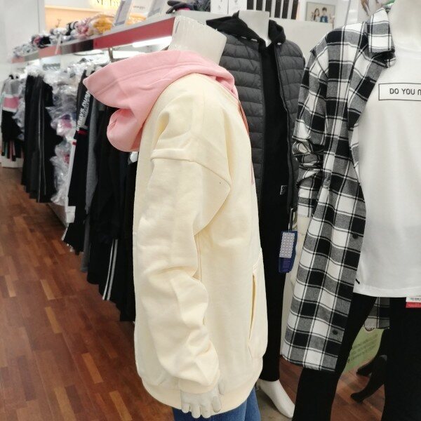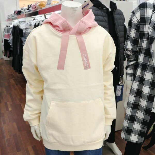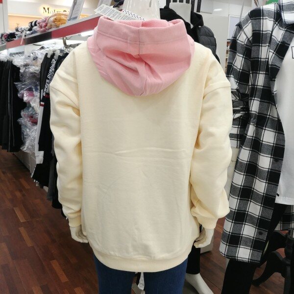 후드부분이 살구핑크인 오버핏 티셔츠입니다.기모가 중간 정도의입니다.포근한 겨울 기모 후드입니다.