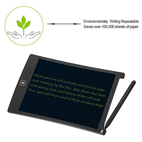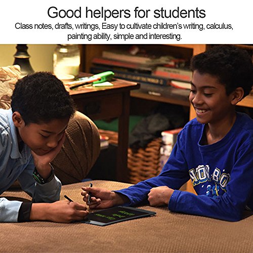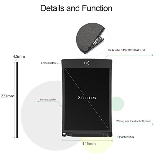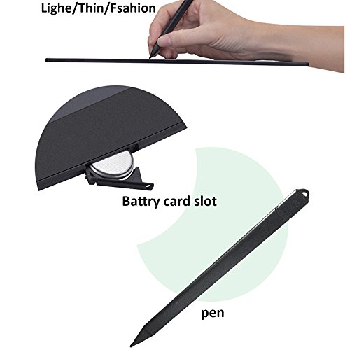 -. Feature : USAGE : The LCD board tablet's pressure-sensitive LCD writing surface creates lines of different thickness based on how hard you push - just like paper and pen. Erase your image with the touch of a button. / APPLICATION: It is suitable for designer, business man, teacher, students, doctor, even housewife for writing to-do lists, shopping lists, appointment reminders,short memos and leaving notes for friends and family. It is really a good learning tool for childern in daily life such as writing, arithmetic, spelling and drawing. / SPECIAL: Eco-friendly environmental protection, paperless, lightweight. It is easy for you to take with in a briefcase or backpack. / SPECIFICATION: Ultra 1/8 thin", 8.5 inch LCD writing table.Dimensions:8.5*5.53*0.2inch. Sealed 3V button cell which will provides over 50,000 erase cycles and it can be replaced. / DESIGN: Ultra-bright LCD writing surface with one stylus and replaceable button cell .The case and LCD are made from durable plastic materials.