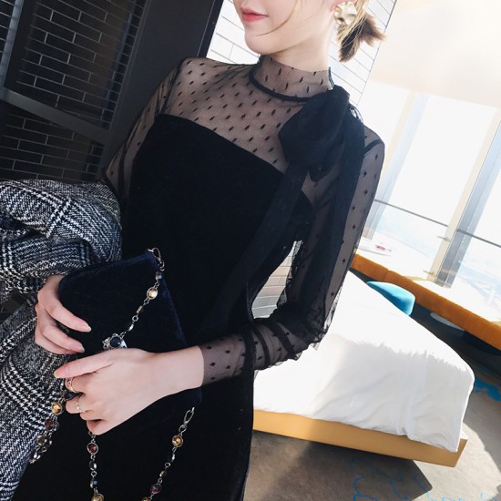 ワンピース ミニ丈 レース ドット 水玉 ベロア リボン ドレス シースルー 透け感 パーティー お呼ばれ服 可愛い drgz1333