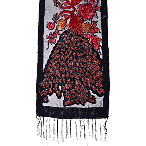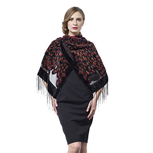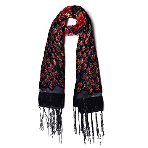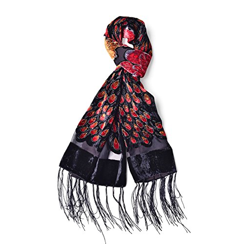 Product Description Lend your favorite black dress, just the right dose of drama with this black, flower and peacock feather printed scarf. Fashioned in 60% viscose and 40% nylon with a hint of red. 0