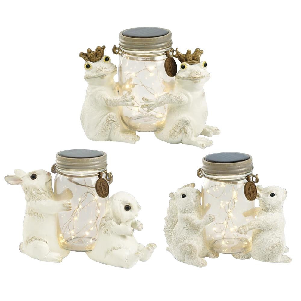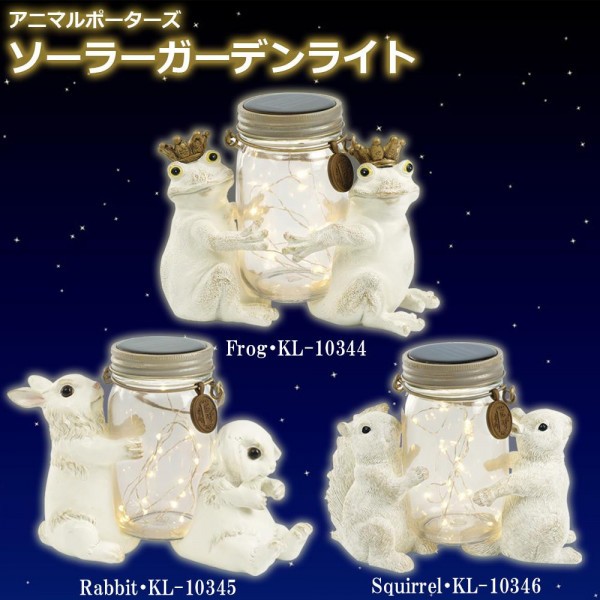 ソーラー充電で、暗くなると自動点灯する機能を備えたガーデンライト。動物とボトルライトはセパレートです。ラッキーモチーフとして人気のカエル、ウサギ、リスの3種類からお選び頂けます。 |