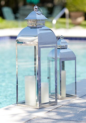 -. Title : Set of 2 Vintage-Style Stainless Steel & Glass Pillar Candle Holder Lanterns 26"