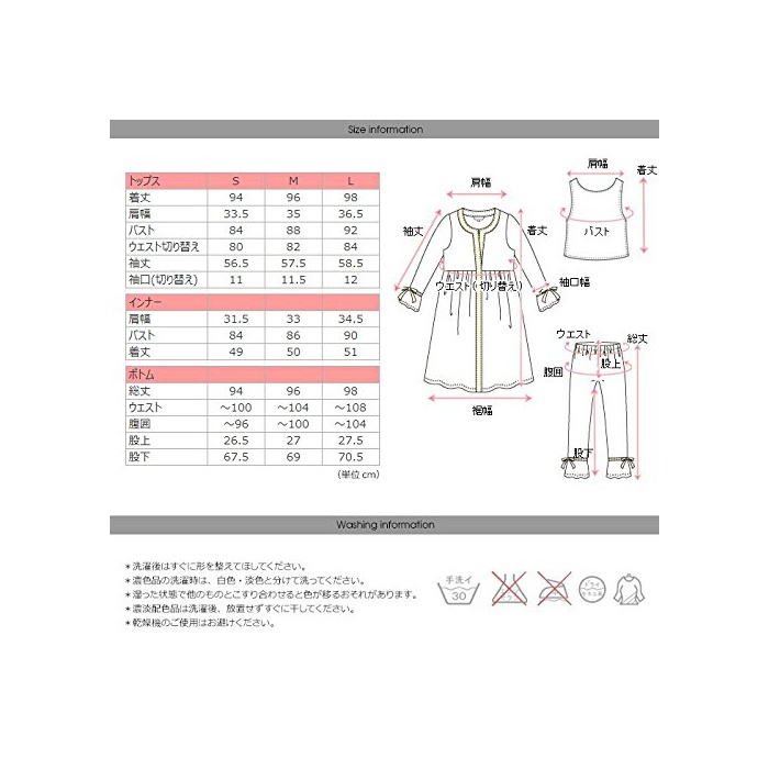 사이즈(cm) S:[톱스]옷 길이94,어깨 폭33.5,바스트84,웨스트 교환80,소매 길이56.5,소매끝(교환)11 [이너]어깨 폭31.5,바스트84,옷 길이49, [bottom]총기장94,웨스트-100,배위-96,밑위26.5,밑아래67.5