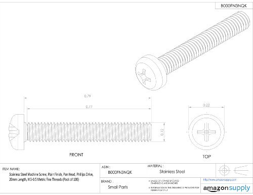 Stainless Steel Machine Screw, Plain Finish, Pan Head, Phillips Drive, 20mm Length, M3-0.5 Metric Coarse Threads (Pack of 100)