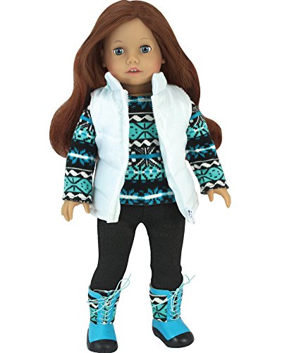-. Feature : 18 Inch Doll's Winter Set, 4 Piece Set of Doll Vest, Doll Shirt, Doll Pants & Doll Boots, Headband not included / Includes Blue and Black P.R.Int Long Sleeve Tee Shirt / Puffy White Quilted Vest, Black Leggings / Matching Blue and Black P.R.Int Winter Boots with Elastic Laces / Made by Sophia's, Leading Doll Furniture, Doll Clothes, Doll Shoes & Doll Accessory Maker!
