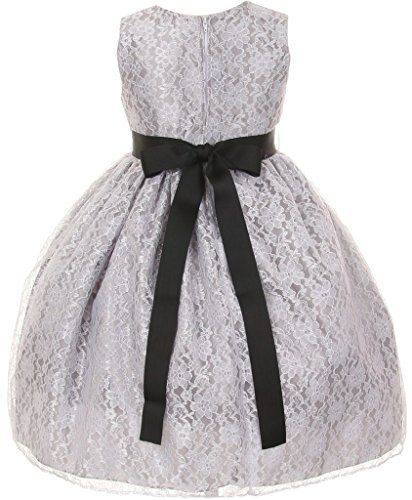 Cute floral and bejeweled accents add flavor to this beautiful dress. The taffeta lace two tone dress features a dazzling pearl, sequin, rhinestone gross grain ribbon belt. Sleeveless dress has an intricate lace overlay. Back zipper closure and ties with a black bow. Made in USA.Feature