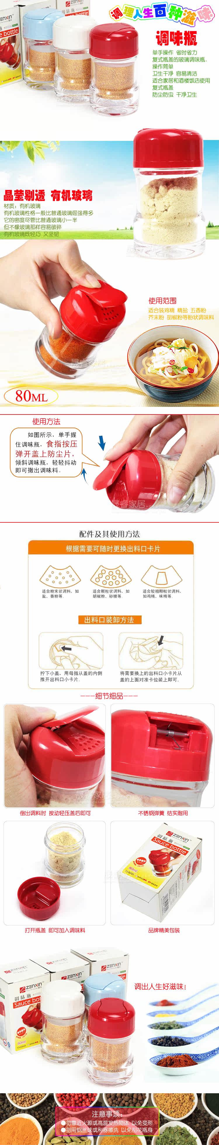 This product uses the glass? much more stubborn than ordinary glass. Despite its density smaller than ordinary glass half? but unlike glass as easily broken. Plexiglass both lightweight and tough? double cap. Dust and insects? clean and sanitary. One-hand operation? saving time and effort? double glass bottle cruet simple operation? sanitation and clean. Easy to clean. Suitable for home? food stores? restaurants? hotels installed monosodium glutamate? chicken? fresh allspice and other seasonings.