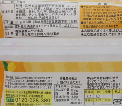 原材料:砂糖、乳等を主要原料とする食品、マンゴーピューレ、卵黄、大豆油/ゲル化剤(増粘多糖類)、香料、乳化剤、酸化防止剤(V.C.酵素処理ルチン)、着色料(カロチノイド)、ph調整剤、(一部に卵・乳成分を含む)