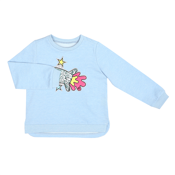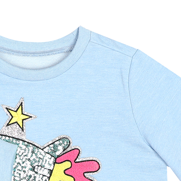 색상-블루사이즈-110,120,130,145,155,165상세설명-기본 라운드 넥의 맨투맨에 스팽글 로켓 모티브가 앞판에 들어가는 디자인입니다. 밑단트임과 뒷기장이 더 길어 활동성을 더한 귀여운 맨투맨티셔츠 입니다.