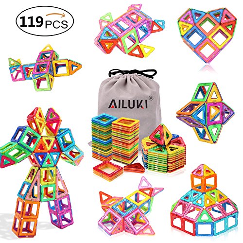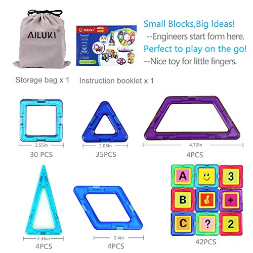 【119 Pieces Magnetic Building Kits】- 30*Square, 35*Triangle,4*long triangle,4*trapezoidal,4*rhombuses,42*alphanumeric cards,1*Instruction Booklet,1*storage bag,all is packed in one box