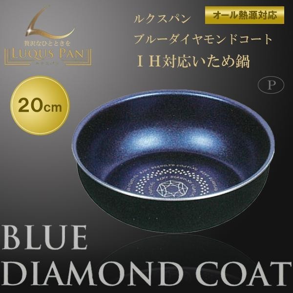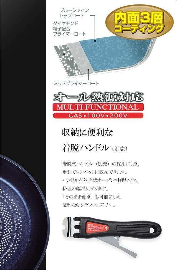 | 丈夫な特殊加工により、変形に強く金属ヘラも使える!ダイヤモンド粒子を配合した強力コーティング「ブルーダイヤモンドコート」が施されています。汚れやコゲがこびりつきにくく、お手入れもラクラク!また、少量の油で調理可能なヘルシークッキングを実現しました。ガス火はもちろん、IH100・200Vをはじめ、全ての熱源に対応可能です。 |