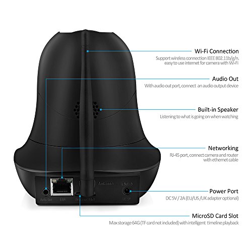 -. Feature : 1080P Full HD: 1/2.7 inch color CMOS sensor (2 Megapixels),Clarity up to 1920 x 1080, and SD card slot (max 64GB supported) for video recording and playback; H.264 video compression format with maximum clarity, High Compression ratio Maximal Frame Rate 30fps to ensure smooth video, Ultra-Wide Angle View let User see bigger, wider and sharper! / Two-Way Audio: With built-in mic and speaker, remotely talk and listen / Pan/Tilt Control :(Pan: 345 degree / Tilt: 90 degree); / P2P/PNP (Plug and Play) Technology (support QR cord scanning to view, without any complicated IP address setting, port mapping and DDNS settings) / H.264 Video Compression ,5x Digital Zoom