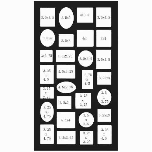 Specs: Holds 29 images between 3.25x2.75" and 4.5x4"; Square, circular, oval and rectangular openings; Vertical and horizontal hanging options