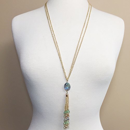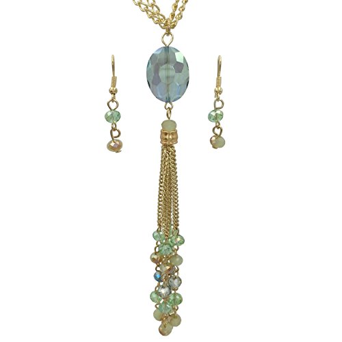 Long Glass Beaded Tassel Necklace & Dangle Earring Set (Green & Brown Gold Tone)
